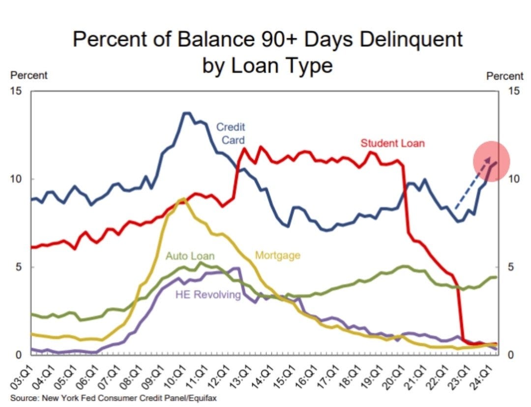 We focus a lot on the potential impact of consumers running out of gas and dialing back spending. U.S. retail sales demonstrated resilience once again in July with a 1% month-over-month gain, but credit card “serious” delinquencies hit their highest level in more than 10 years.