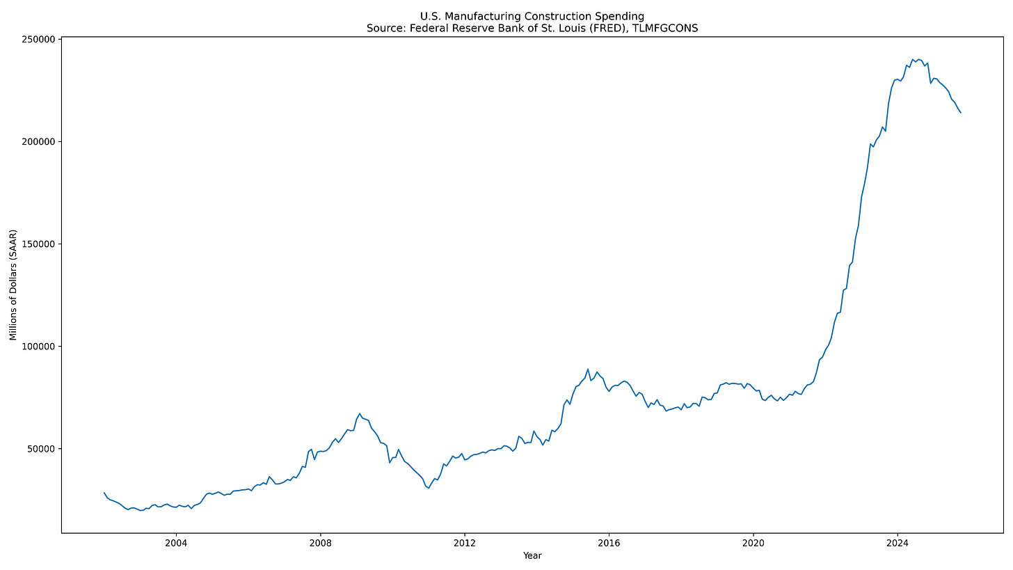 Industrial reshoring demonstrates another timing gap. U.S. manufacturing construction spending surged from early 2023 levels and remained elevated into 2025.¹³ That is the policy and capex lead. Caterpillar’s shipments, dealer inventories, and margins respond afterward. The company also noted that higher tariffs can pressure manufacturing costs before pricing fully adjusts.¹⁴