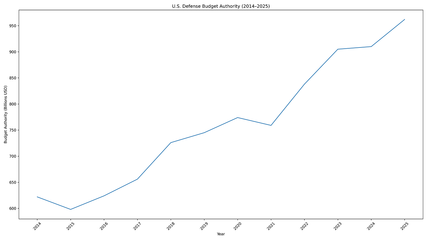 Rearmament is visible in budgets. The U.S. FY2026 discretionary request proposes a significant increase in defense outlays.⁶ NATO data show European and Canadian defense spending rising sharply into 2025 estimates.⁷ These are not abstract narratives. They are budgetary commitments that translate into multi-year procurement cycles.