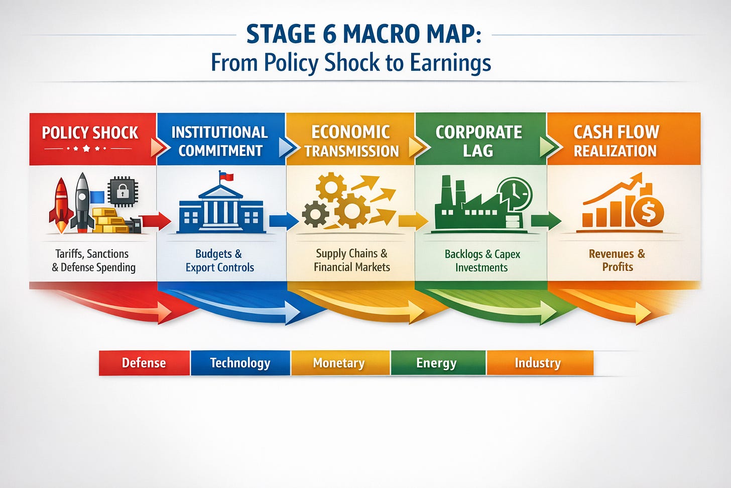 Stage 6 investing demands discipline around timing. Policy and institutional commitments move first. Earnings, margins, and cash flows respond later.
