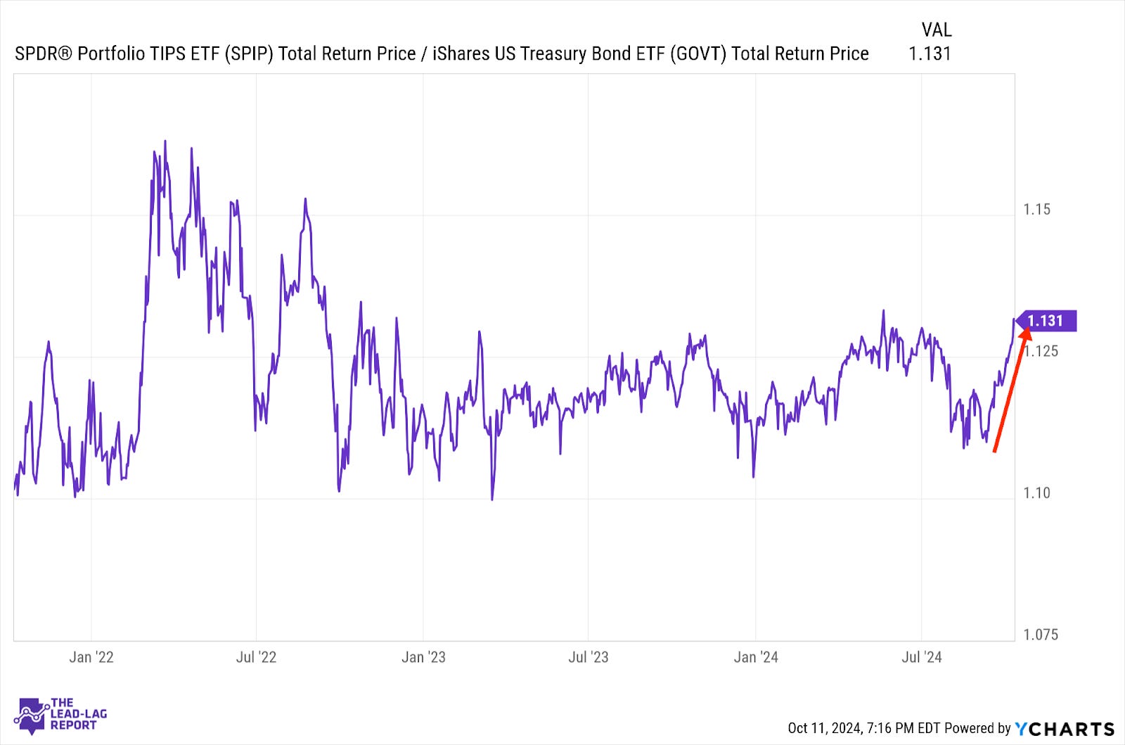 I don’t think we should ignore the fact that TIPS have been outperforming as strongly as they have over the past month. Healthy growth plus a resilient labor market plus easing monetary conditions create a scenario where inflation could easily spiral higher again and I think the bond market is definitely sensing some of that. This ratio turned higher well in advance of inflation rates soaring in 2021 and could be signaling something similar here again.