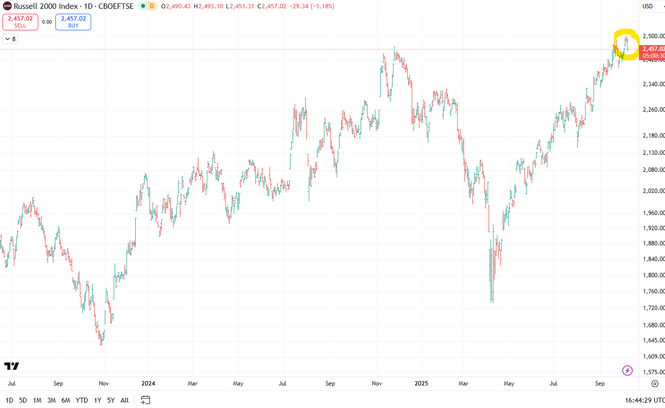 The Russell 2000 — a barometer of small-cap performance — has quietly taken a turn for the worse. Following a decent third quarter that for a time was better than large-caps, small stocks rolled over again in early October.⁶ That reversal is meaningful. Small-caps are higher-beta, more sensitive to credit spreads and liquidity moves; when they lag large-caps even as the latter continue to edge higher, it is a sign of shrinking breadth and fading confidence.