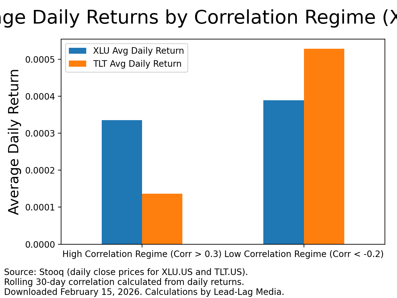 That pattern has reemerged in recent weeks. The Utilities Select Sector SPDR ETF (XLU) and the iShares 20+ Year Treasury Bond ETF (TLT) have frequently moved in the same direction across multiple sessions.¹ ² The pairing matters because it reflects a classic defensive alignment that many investors had written off during years when diversification seemed unreliable.