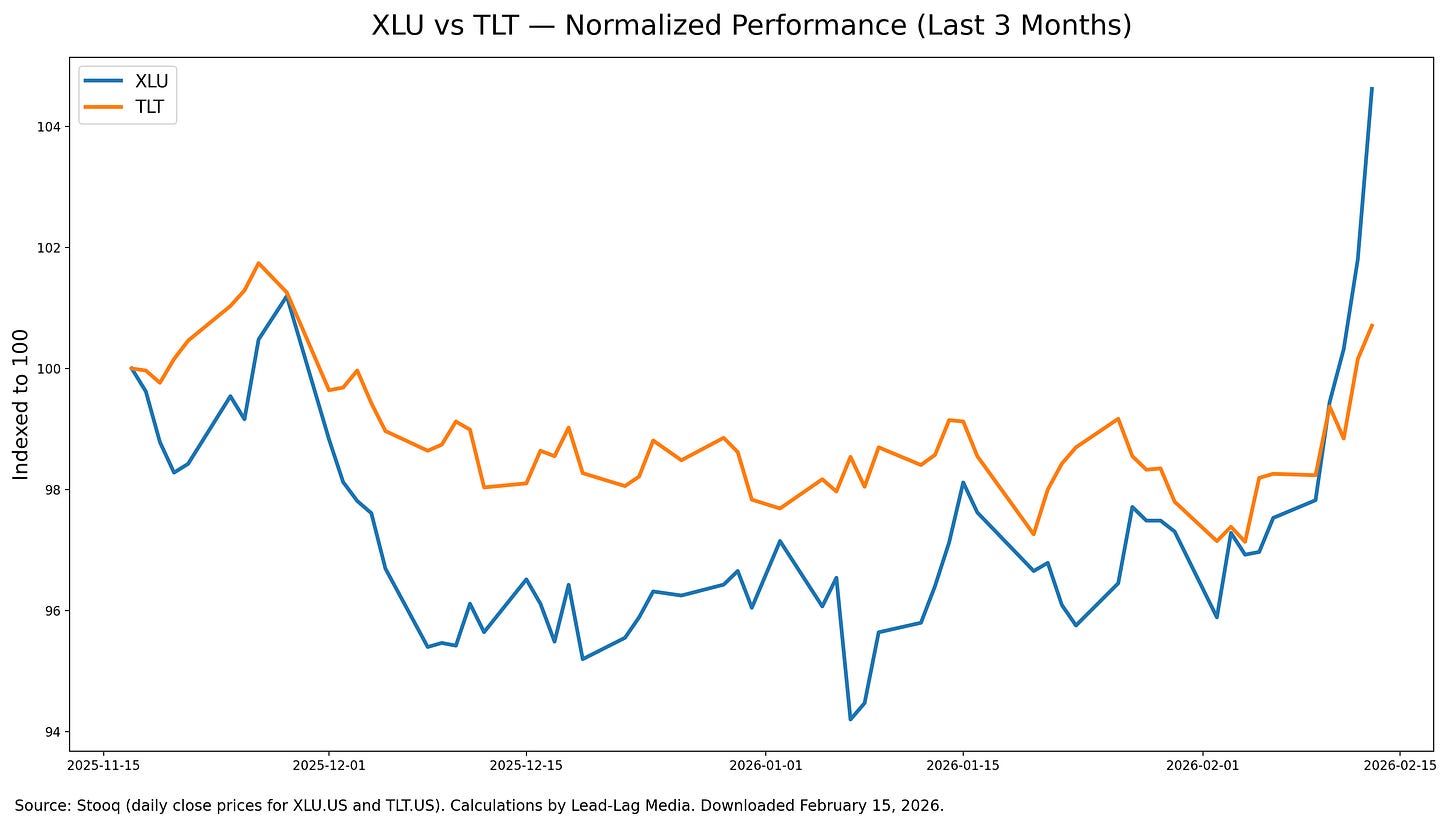 This is not merely about two ETFs rising together. It is about what that co-movement signals. Utilities represent defensive equity exposure. Long-duration Treasuries represent high-quality duration. When both attract capital simultaneously, the market is revealing its macro preference.