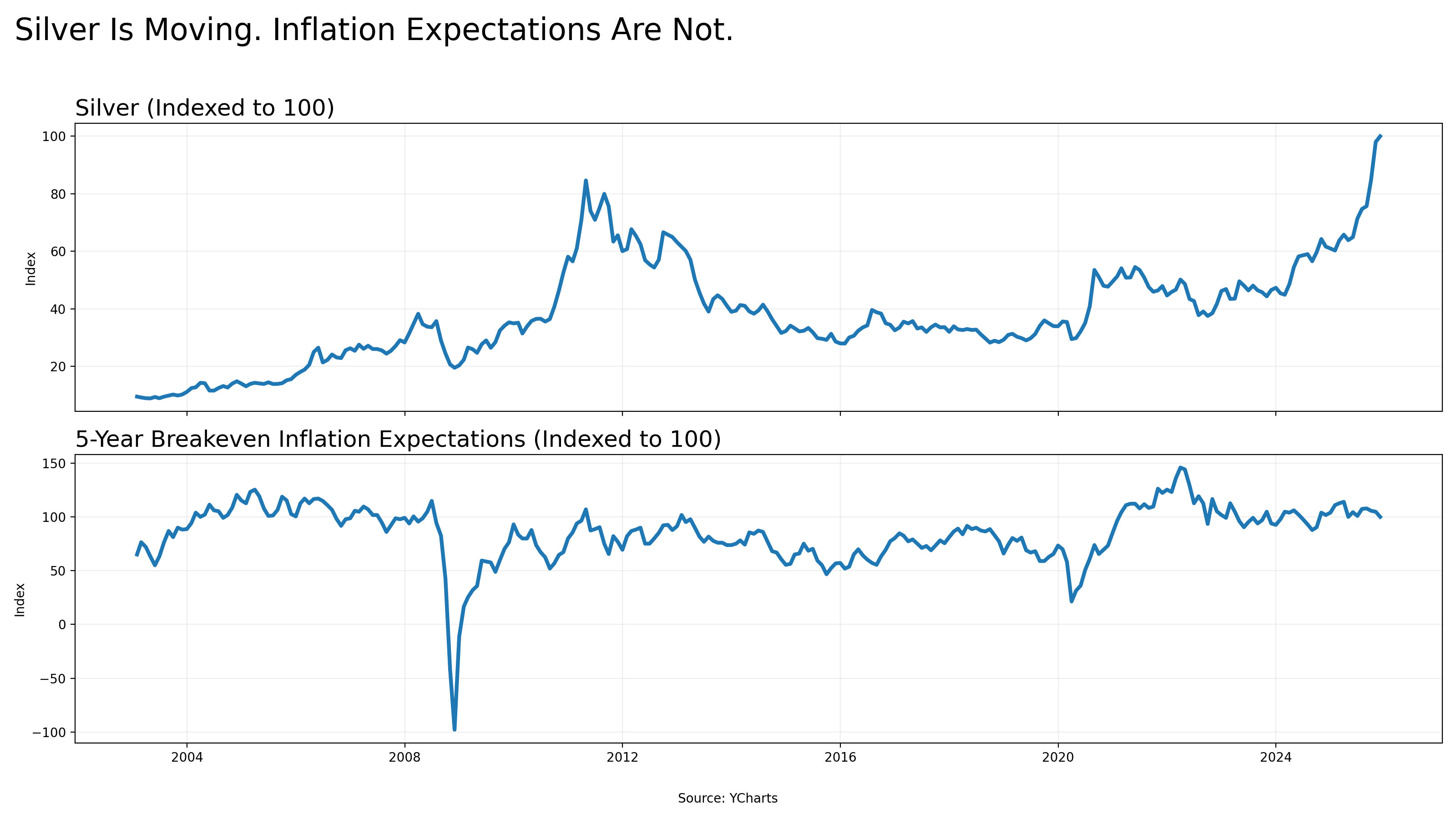 In past cycles, similar divergences between silver prices and inflation expectations have coincided with economic regime shifts, not soft landings.
