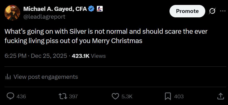 This move is not a vote of confidence in growth or policy. It is a hedge against dysfunction. The market is telling us that something beneath the surface is breaking down, and silver is where that anxiety is showing up first.