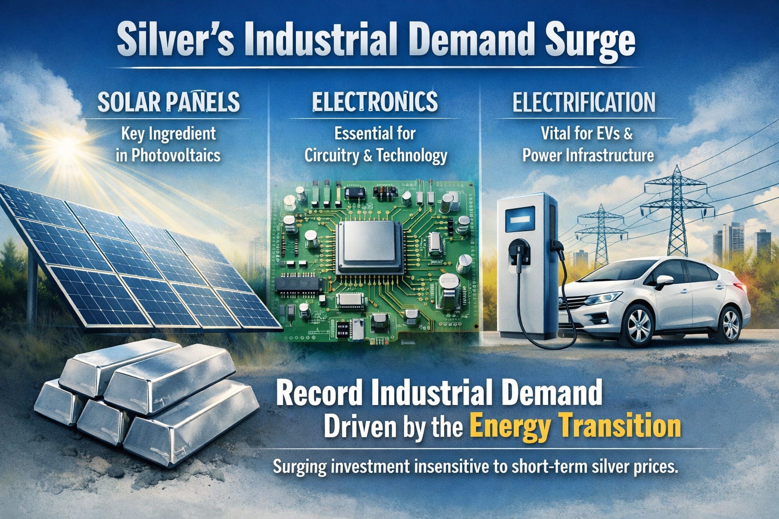 Silver is not just a monetary metal. It is deeply embedded in industrial processes, particularly in solar panels, electronics, and electrification infrastructure. Industrial demand reached record levels this year, driven by energy transition investments that are largely insensitive to price in the short term.⁵