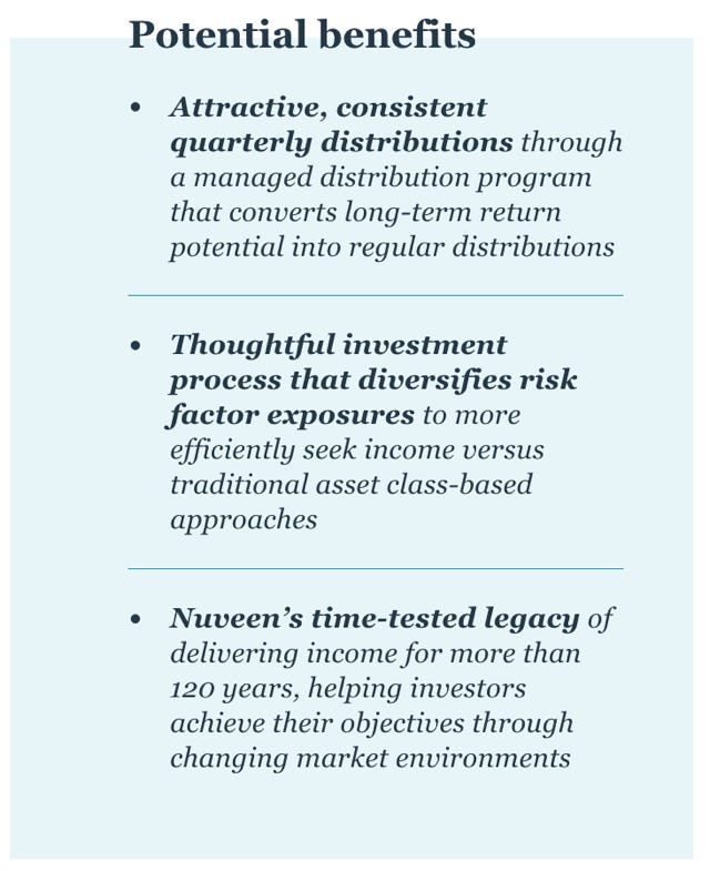 NMAI’s investment objective is to provide attractive total return through high current income and capital appreciation. It dynamically invests in a portfolio of equity and debt securities of issuers located around the world. This dynamic investment strategy uses a risk-based framework in which any amount can be allocated to an asset-class at any time and invest in equity & debt securities of any type without limit. The fund also uses leverage to enhance yield and total return potential.