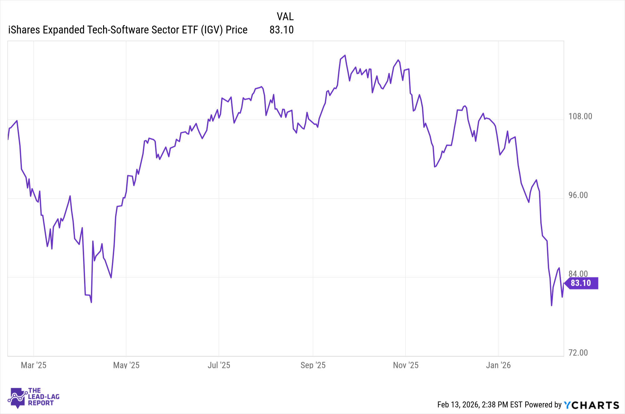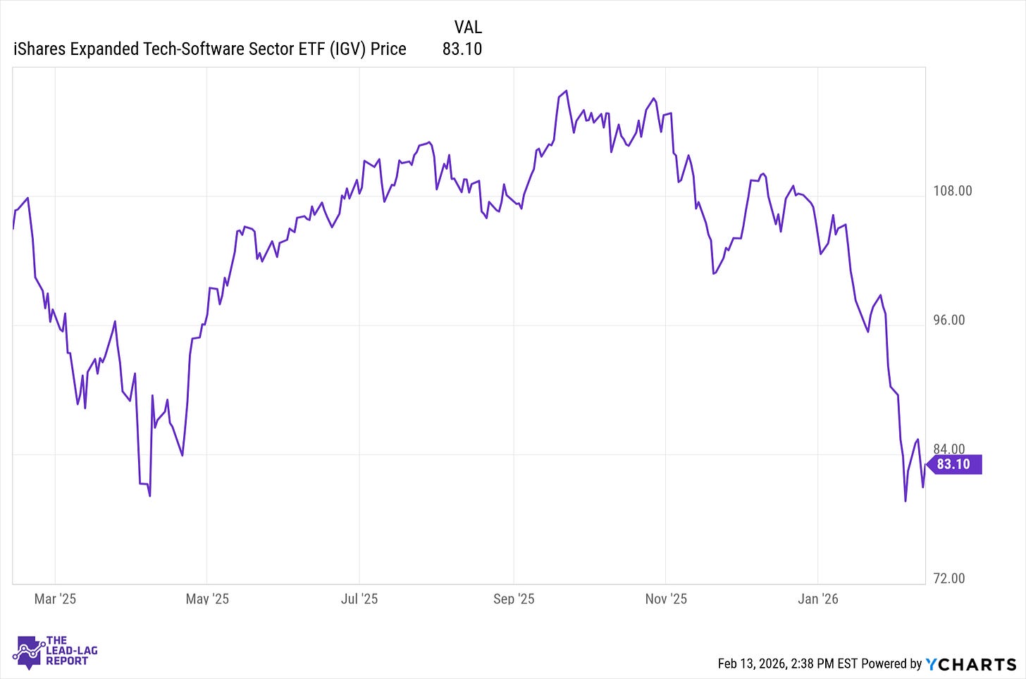 The repricing is visible in the iShares Expanded Tech-Software Sector ETF (IGV), which showed a materially negative year-to-date return as of mid-February 2026.⁵ That move reflects aggressive de-risking rather than confirmed collapse in enterprise software spending. Reuters reporting in late January described broad declines across software names as investors leaned into a “worst-case” AI disruption scenario.¹