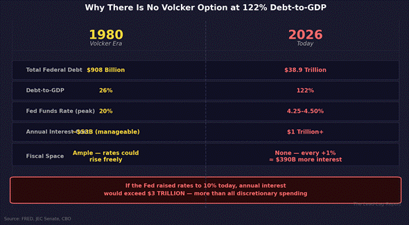 Here is the critical point: every 1% increase in interest rates adds roughly $390 billion in annual interest expense on $39 trillion of debt. If the Fed raised rates to just 6% — still well below Volcker’s 20% — the annual interest bill would approach $2.3 trillion, consuming nearly every dollar of individual income tax revenue.[8] If it raised to 10%, interest payments would exceed $3 trillion — more than all discretionary spending combined. There is no Volcker option at 122% debt-to-GDP.