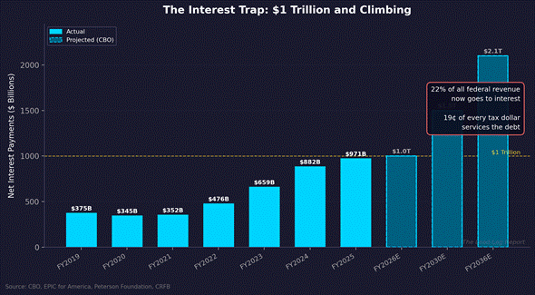 [6] Committee for a Responsible Federal Budget, “Net Interest Costs Will Double, Again, Over the Next Decade,” February 24, 2026. Interest nearly tripled from $375B in FY2019 to $971B in FY2025.