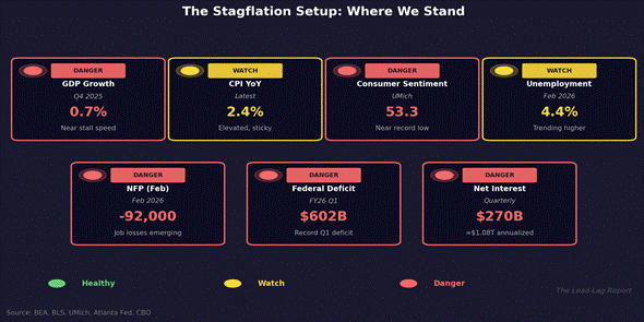 • GDP growth collapsed to 0.7% annualized in Q4 2025, nonfarm payrolls turned negative (-92,000 in February), and consumer sentiment sits at 53.3 — near historic lows.