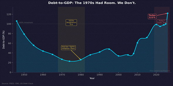 • U.S. national debt has crossed $39 trillion — a 43x increase from the $908 billion Volcker had to work with in 1980. Debt-to-GDP sits at 122%, nearly five times the ~26% level during the last stagflation.