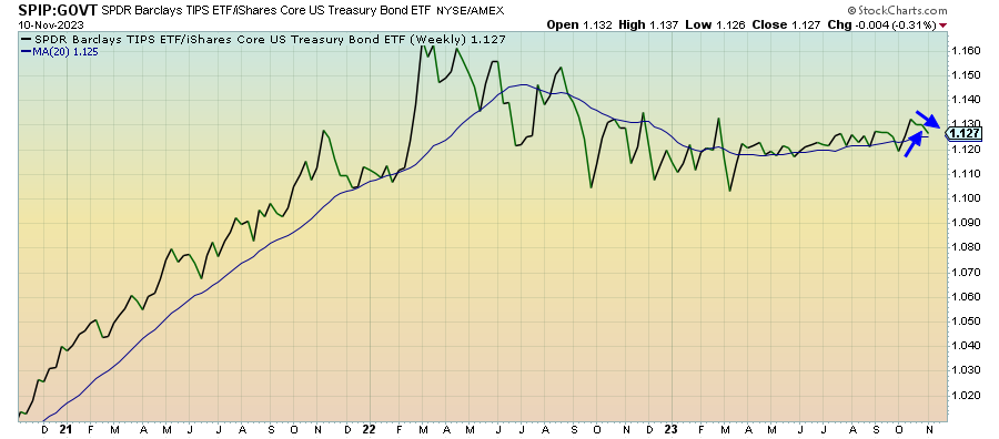 The October CPI data we’ll get later this week will very likely suggest that inflation is still moderating, but nowhere near the Fed’s target 2% rate. The market seems to have long since priced in a longer-term inflation rate of ~3% through the end of 2024, so there’s no huge demand for inflation protection at the moment. I suspect that’ll continue for the near-term barring some type of major economic developments.