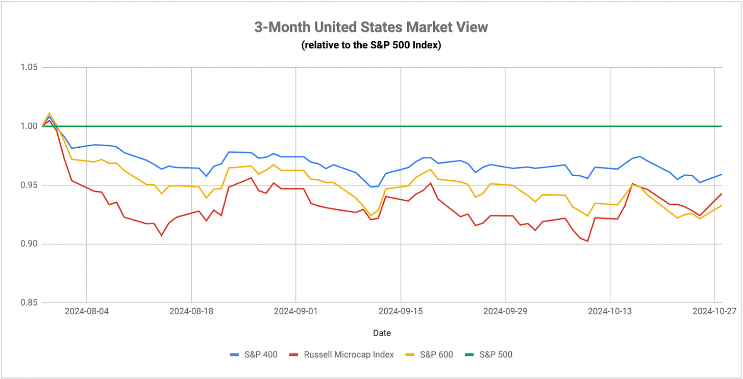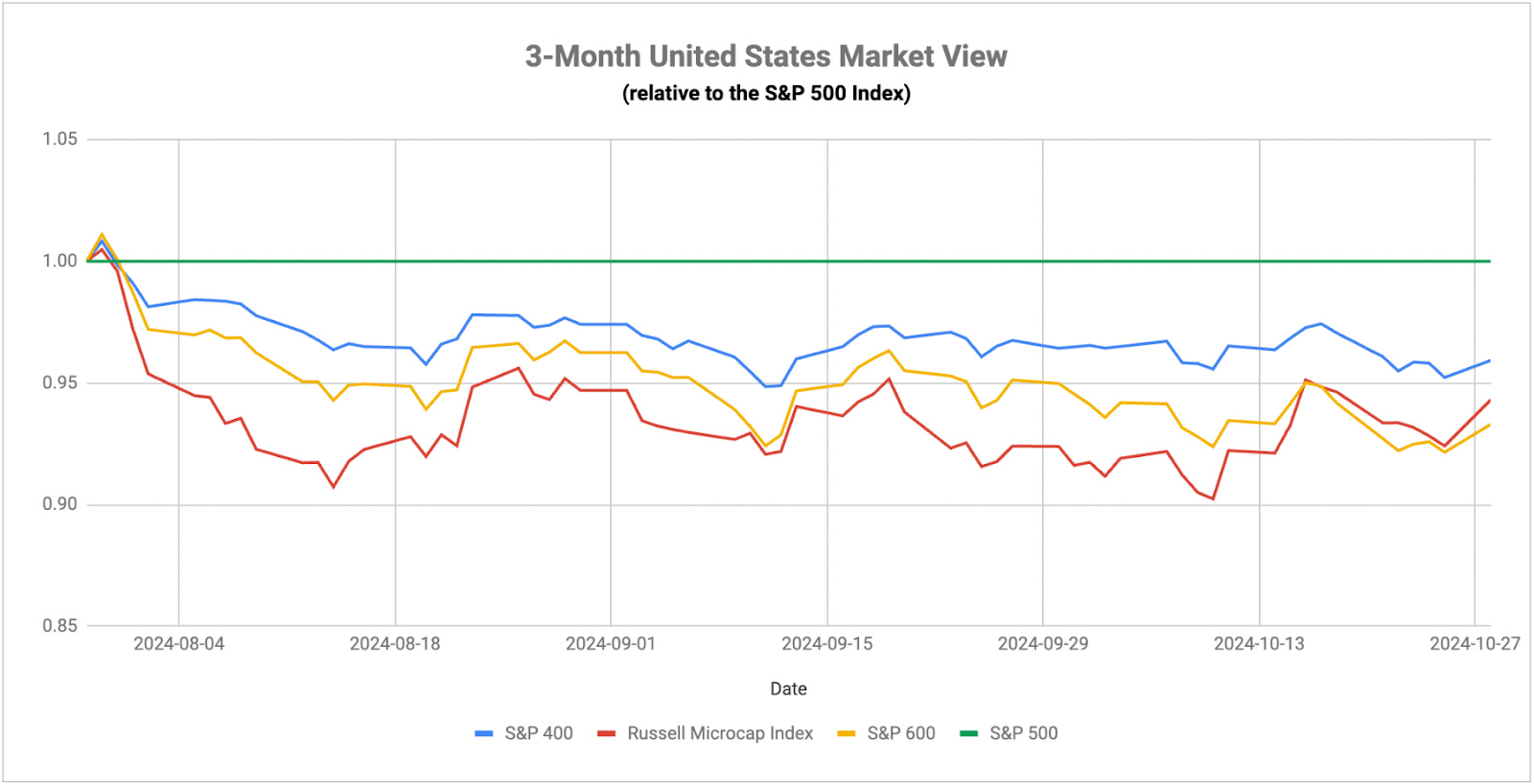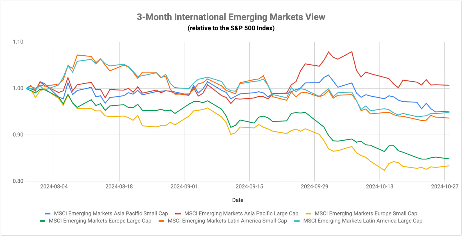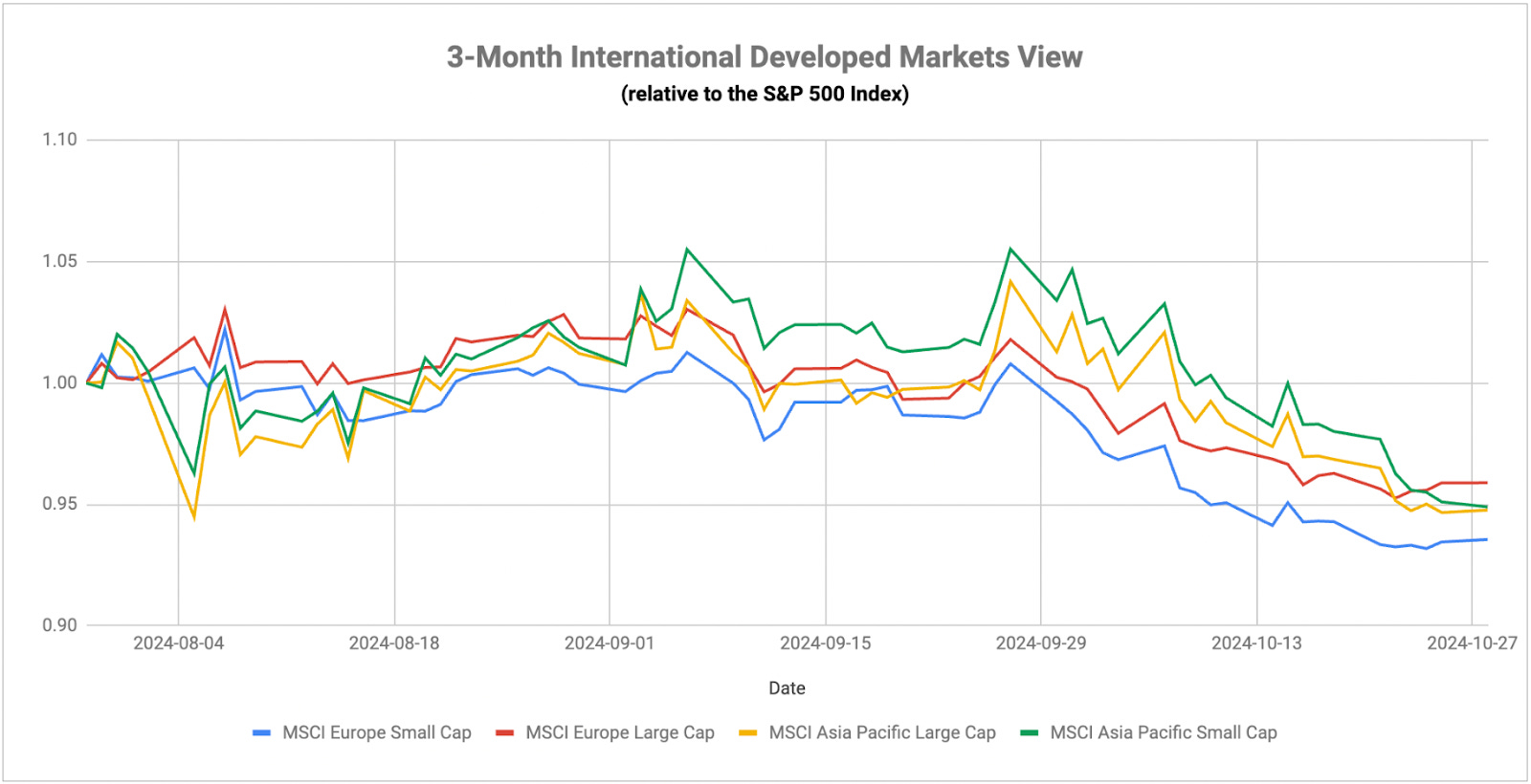 U.S. large-, mid- and small-cap stocks have all been performing at roughly the same pace since mid-August, offering no real signs that any one of these groups is aiming to take the lead, but the real action might be in the Treasury market. The 10-year Treasury yield is only back to the level it was in July, but that’s an increase of 65 basis points off of the September low. The bond market seems to be getting increasingly concerned about the latest election rhetoric being thrown around, which includes tax cuts, heavy government spending, possible tariffs and a general disregard for current debt loads and deficits. Regardless of who wins, the question isn’t “if”, but “how much”. Bond market volatility, as measured by the MOVE index, is at its highest level in a year and there is growing worry that inflation could be primed to make a comeback.