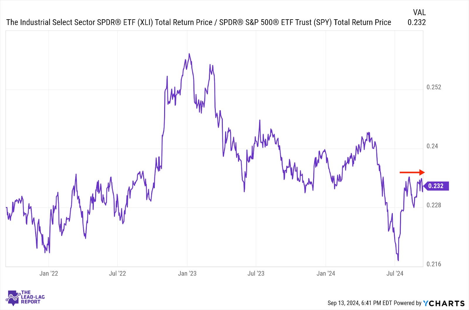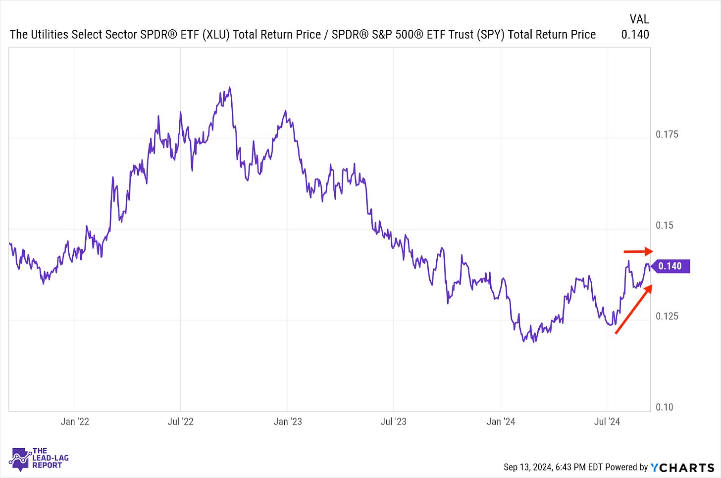 Utilities maintains its firm uptrend relative to the broader market and has actually been distancing itself from the field in becoming the best-performing sector year-to-date. Falling interest rates will no doubt benefit this high debt sector, but overall risk-off sentiment despite last week’s rally is likely going to be the driver. Until this sector, gold and/or Treasuries break down, this looks like a risk-off market.