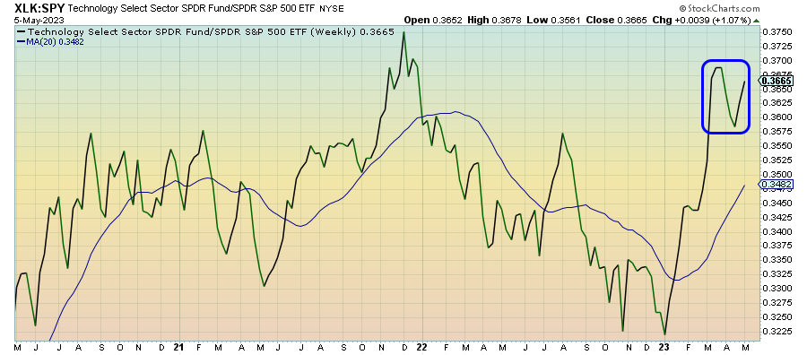 Tech stocks are suddenly getting bounced around quite a bit, but good news from the Fed and the labor market is pulling the buyers back in. I want to emphasize, as I did last week, that the gains in this ratio are being driven by a few mega-caps. The broader sector has not performed nearly as well and I think we need to pay attention to that as a sign of sentiment. Tech is still a “safe place” for some investors, but the volatility is concerning.