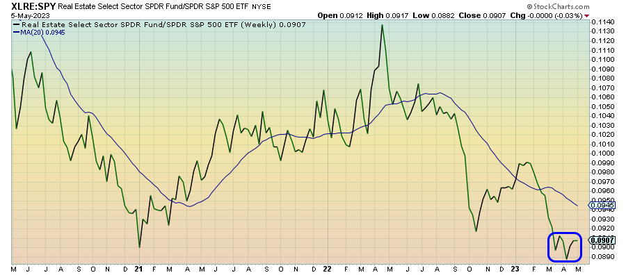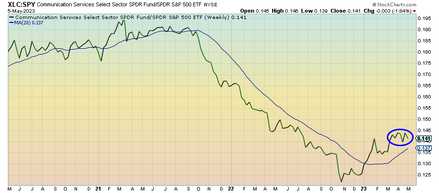 Communication services stocks are kind of holding the line here, seemingly past the conditions that saw them underperform in 2022, but also seeing the 2023 rally starting to fizzle. The positive earnings results from Facebook and Alphabet are certainly providing a bit of a bullish tone to the sector, but the ad revenue environment, while solid in Q1, will need to be monitored for deterioration.