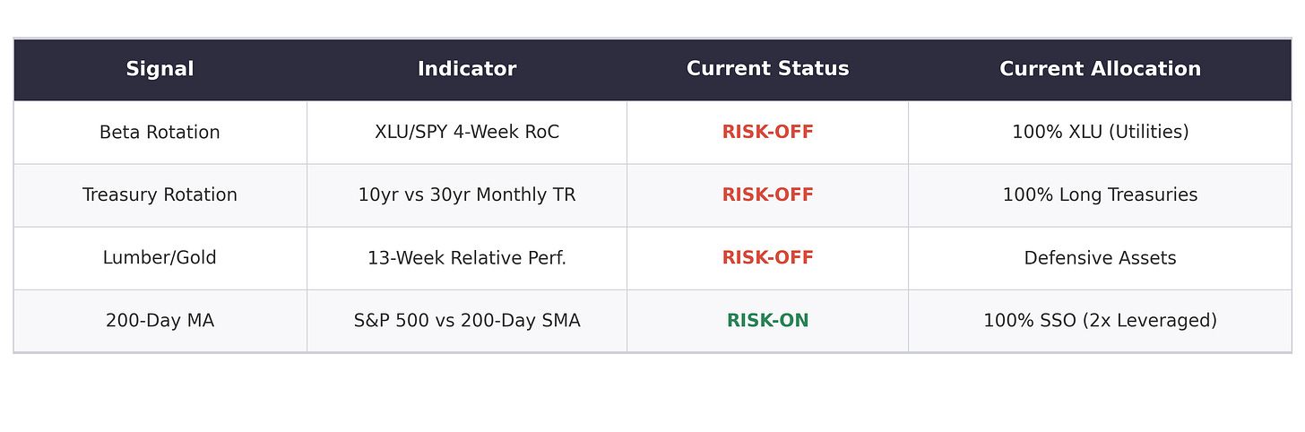 The Lumber/Gold divergence tells the starkest story. Gold has returned +20.02% over the past 13 weeks, holding above $5,100/oz as safe-haven demand surges alongside inflation hedging and geopolitical risk premiums. Lumber has returned a negligible +0.45% over the same period — barely positive — as the cyclically-sensitive commodity most tied to housing and real economic activity stalls completely. With oil prices threatening a broad economic slowdown, Lumber’s stagnation is a leading indicator of the growth headwinds ahead. All seven Lumber/Gold sub-strategies remain positioned defensively.