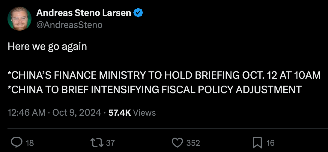 We don’t yet understand the composition and depth of the Chinese stimulus measures. At the initial announcement, they discussed rate cuts, lower mortgage rates and various measures of support for the real estate and stock markets. There haven’t been a great deal of specifics up to this point, but it sounds like we may get more soon.