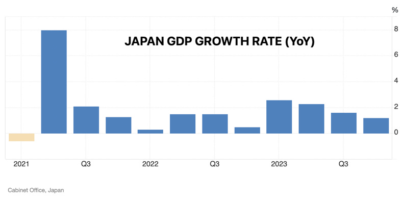 Japanese GDP grew by 1% in both the 1st and 2nd quarters of 2023 but shrank by 0.8% in the 3rd quarter. The avoidance of a technical recession in Q4 was a positive sign, but the degree of volatility on a short-term basis makes it difficult to discern what the longer-term trend is.