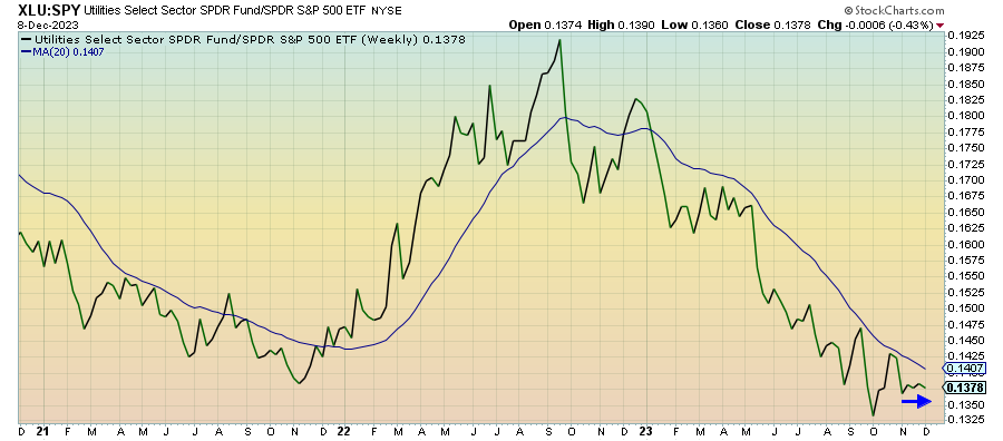 Utilities have finally settled down, but they’re not indicating the risk-on signal that investors want. There’s not much defensive in equities right now that’s showing strength, but the sharp drop in interest rates continues to provide a boost to this debt-heavy sector. Since a lot of the economic numbers we’ll get this week will have an impact on rates, expect a potentially higher degree of volatility.