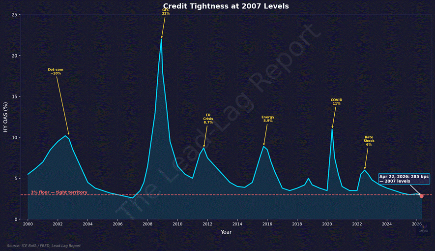 • The ICE BofA US High Yield Master II option-adjusted spread closed at 285 basis points on April 21, 2026 — levels last seen at the June 2007 cycle low, seven months before the Great Financial Crisis began.[1]