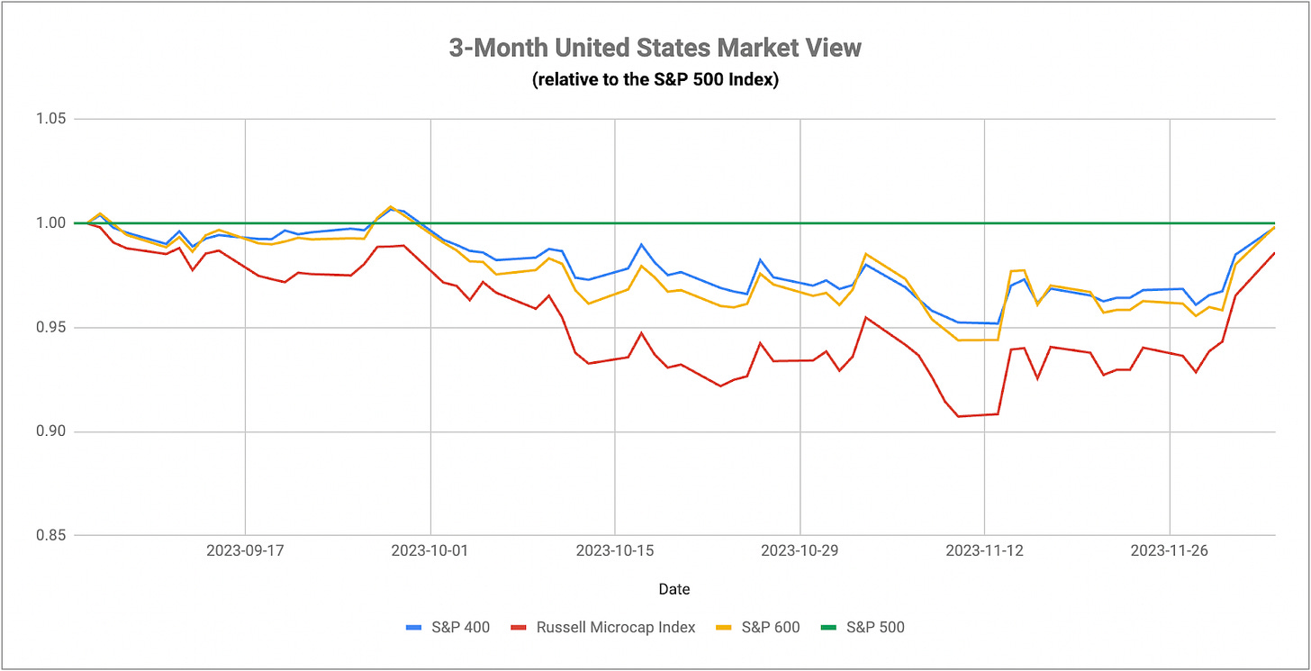 November delivered big gains for both equities and long-term Treasuries, but December, thus far, has presented a bit of a different narrative. There’s been a fairly decisive shift from large-cap growth & tech to small-caps, value stocks, cyclicals and long duration Treasuries. In reality, this is a trend that’s been building over the past few weeks and comes in the follow-up to the Fed’s neutral stance and cooling inflation trend. Investors seem to be buying more and more into the soft landing narrative that would be fueled by Fed rate cuts, currently anticipated to start as early as March. Cyclicals and value stocks tend to outperform in early stage economic recovery cycles, but the question now becomes is this a genuine turn or just a fake-out before the approach to recession?