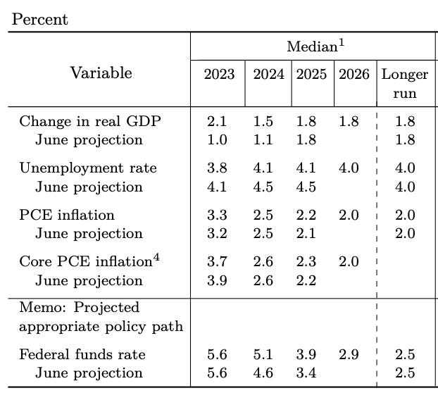 Compared to their June projections, the Fed has adjusted growth projections higher, the unemployment rate lower & core inflation lower (and eventually down to a modest 2.6% rate next year). In other words, the Fed thinks it’s going to pull off the soft landing that the market pretty much has priced in at this point. Powell said, “What we have right now is what’s still a very strong labor market that’s coming back into balance. We’re making progress on inflation. Growth is strong.”