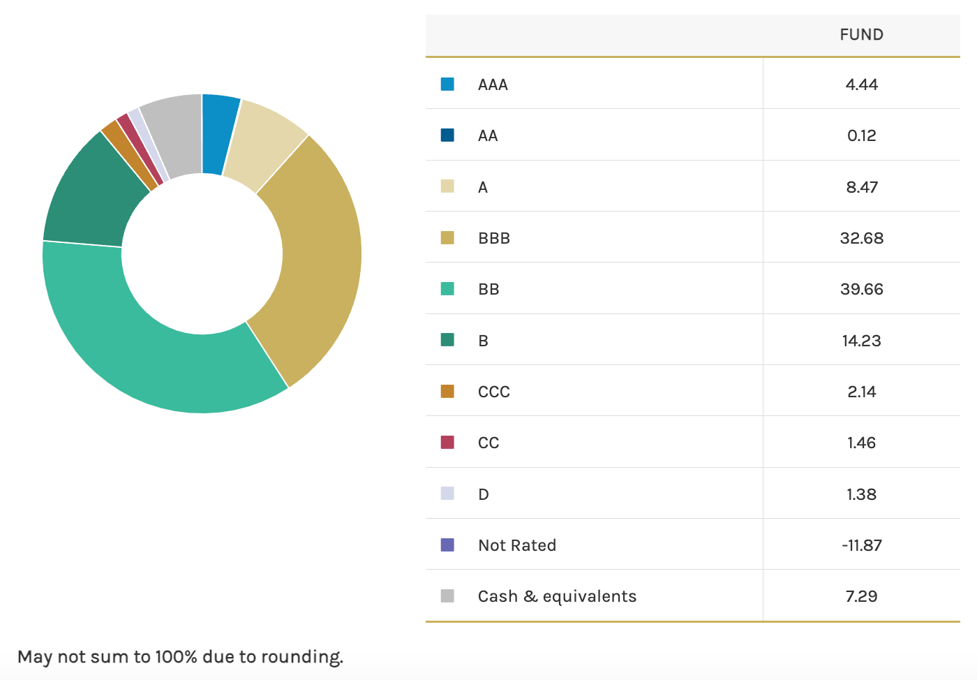 Emerging markets debt tends to be lower rated because, well, their economies are emerging. It’s not a bad mix though since nearly half of the fund’s assets are rated investment-grade. Most of it is in the BBB-rated category though, which means it could teeter on the edge of sliding into the junk category if conditions start to deteriorate.