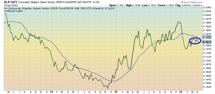 Like utilities, consumer staples stocks are all over the place relative to the broader market and failing to provide a definitive signal. The latest pullback in the year-over-year inflation rate (a trend which will probably continue through June) could make consumers feel more comfortable about spending again, but the data has yet to fully support the narrative. Retail sales and consumer confidence levels remain tepid.