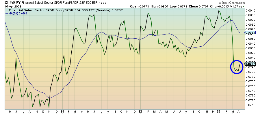 The bottom in financial stocks looks to be in and the earnings results we got last week from JPMorgan Chase and Citigroup are likely to reinforce investor confidence further. From what we’ve seen, there’s been a lot of shuffling around of deposits, but few liquidity issues beyond the SVB and Signature failures. Commercial real estate risk is likely to continue impacting smaller banks, but the big banks look like they’re in fairly good shape.