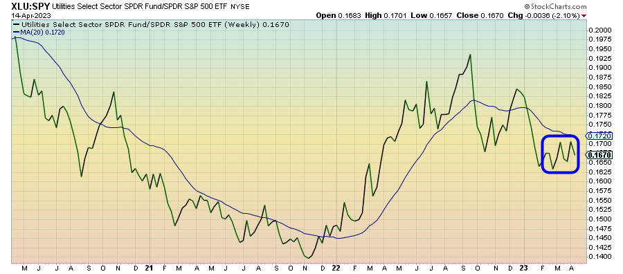 As has been the case pretty much throughout 2023, utilities continue to signal that short-term sentiment is very hot and cold based on whatever the latest data point is. CPI and PPI numbers were the catalyst last week and, even though another quarter-point hike from the Fed is likely in a couple weeks, investors are growing more comfortable with the idea that May is probably the end point in the hiking cycle.