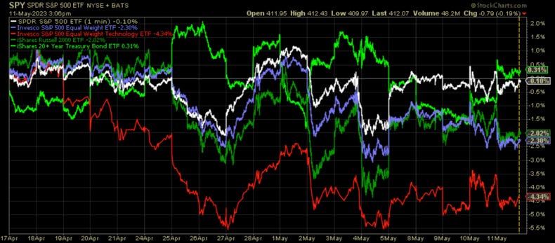 This is a chart I’ve alluded to recently. With the cap-weighted indexes so top-heavy, the equal-weight indexes provide a better sense of what the market is really doing. The equal-weight S&P 500 is down more than 2%. The equal-weight tech sector is down more than 4%. The Russell 200 is also down 2% over the same period. Keep in mind that these returns happened during a period where Q1 earnings reports were generally pretty good, especially among the FAAMG names, we got a lower than expected inflation read and what’s effectively a policy pause from the Fed. Those should have all been positive catalysts, but they haven’t been.