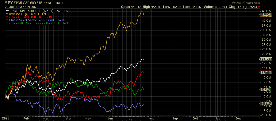 Led by the FAAMG rally, the S&P 500 is up nearly 20% on the year and the Nasdaq 100 has gained more than 40%. Utilities are actually still down on the year and, while the Russell 2000 has lagged large-caps, it’s understandable given how narrow market leadership has been. It turns out that the economy has been stronger & more resilient than expected and the intermarket signals were sniffing this out early on.