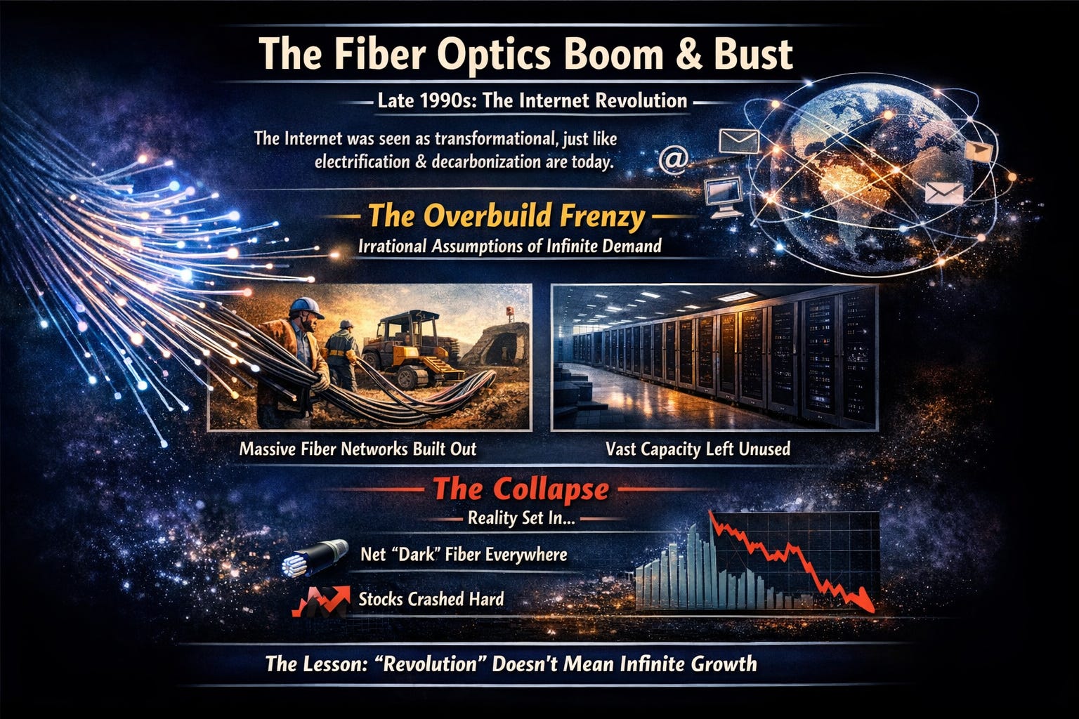 The late 1990s offer a useful analogy. The internet was transformational, just as electrification and decarbonization are today. That did not prevent investors from massively overbuilding fiber-optic networks based on assumptions of infinite demand. When the cycle turned, the majority of that infrastructure sat unused, and the stocks tied to it collapsed.⁵