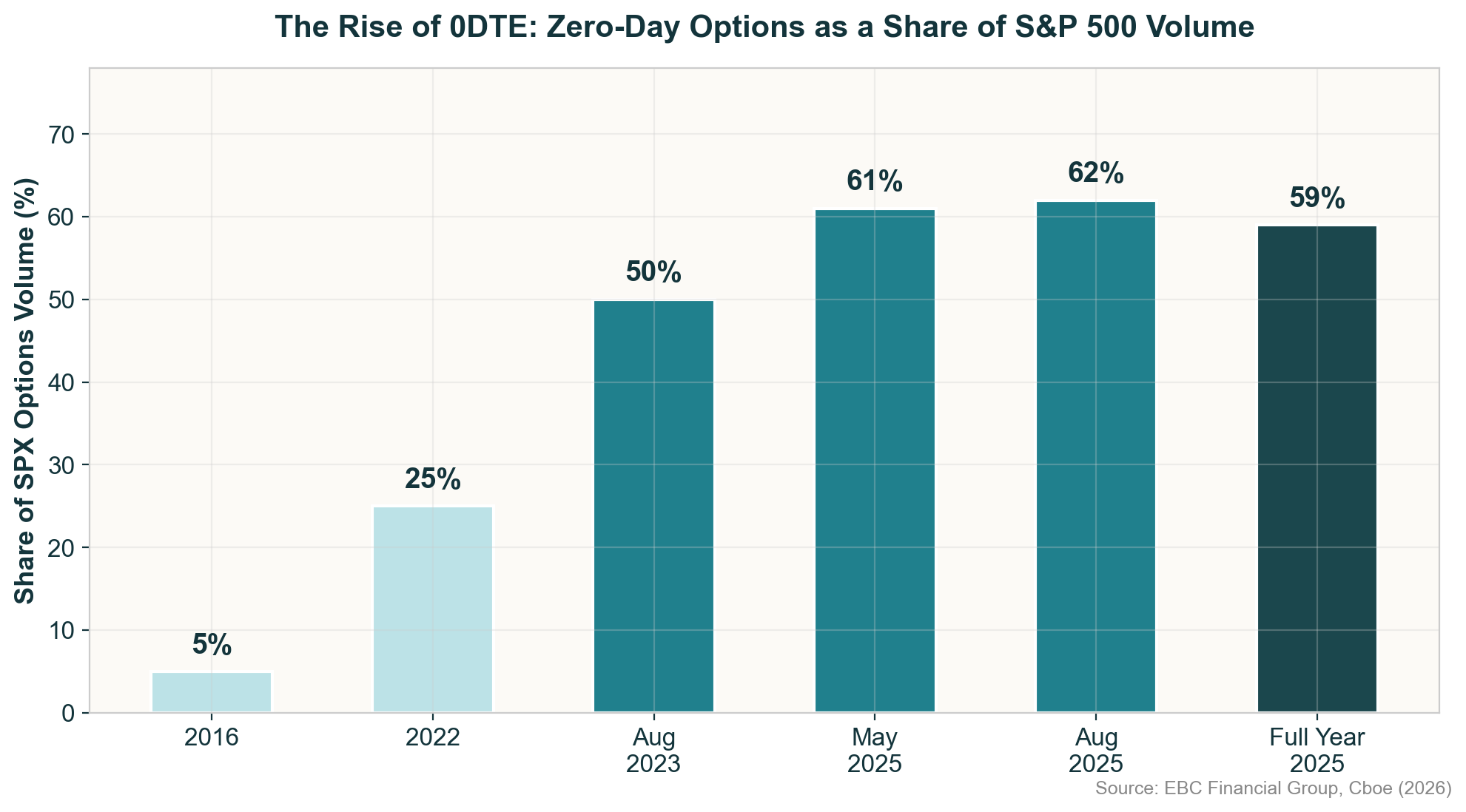 Figure 4: 0DTE options have surged from 5% of S&P 500 volume in 2016 to nearly 60% by 2025, fundamentally reshaping how institutions and retail investors manage short-term risk.