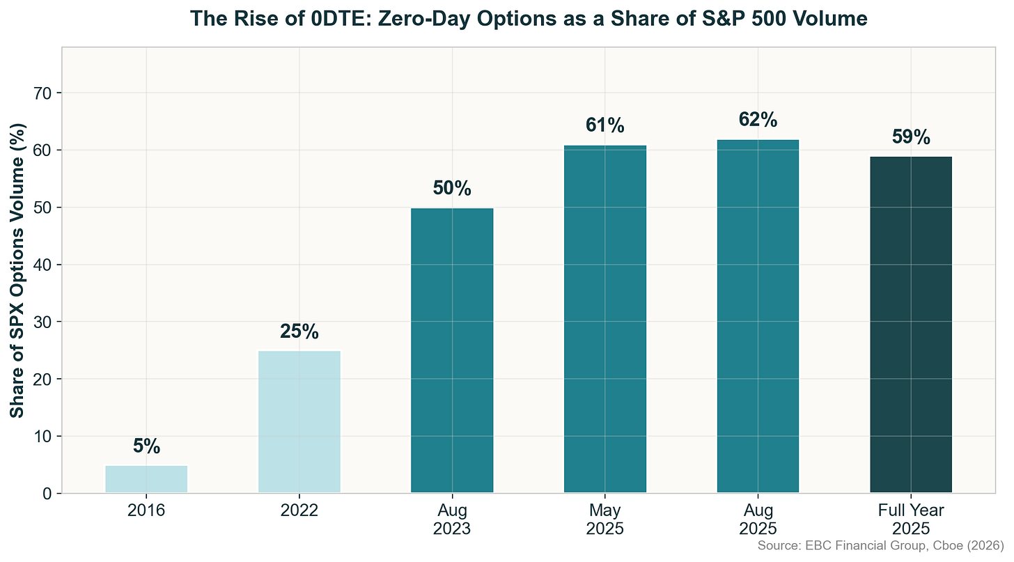 Zero-days-to-expiration options—known as 0DTE—have become one of the most important structural developments in modern markets. In 2025, SPX 0DTE contracts averaged 2.3 million per day and represented 59% of total S&P 500 options volume.10 These are not fringe instruments. They are the new baseline.