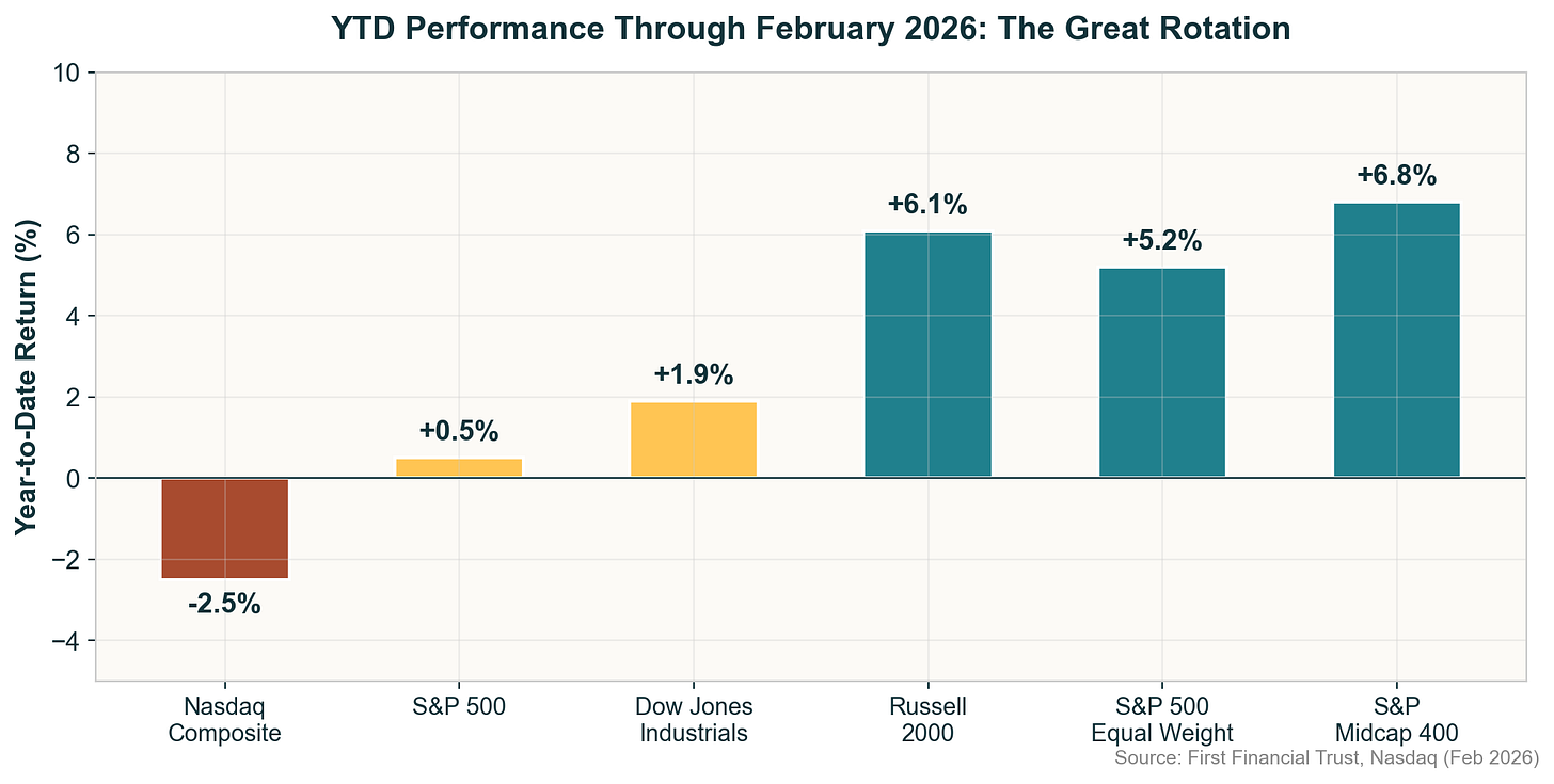 February was a rough month for tech investors. The Nasdaq 100 fell 2.3%, its steepest monthly decline since March 2025, while the Magnificent Seven Index dropped 7.3%.1 The S&P 500 Equal Weight Index, meanwhile, surged 3.5%—its best month since May 2025. The message from the market was clear: the era of being rewarded simply for owning the biggest names in tech is being challenged.