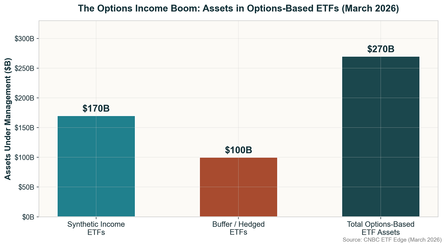Capital has been flooding into options-based ETFs as a result. According to CNBC, approximately $170 billion has been allocated to “synthetic income” ETFs that use options for income generation, alongside $100 billion in “buffer” ETFs for downside protection.9