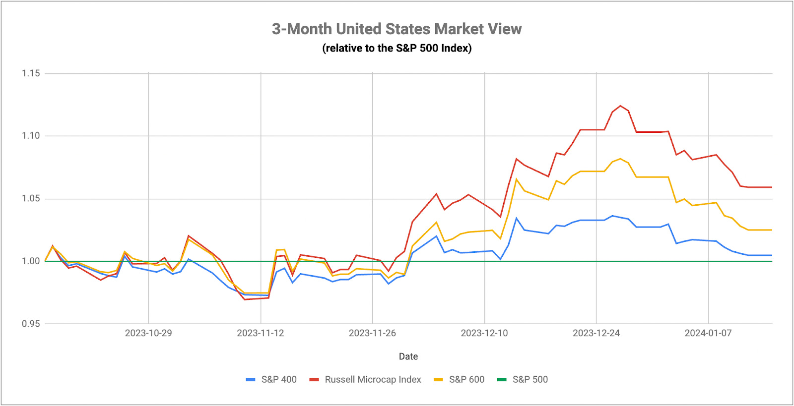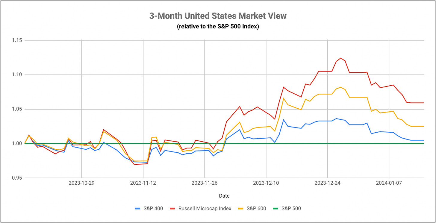 The markets spent most of the 4th quarter of 2023 rallying on the idea that the disinflationary trend would continue making progress and the Fed would finally be able to loosen monetary policy again. Cyclicals and small-caps rallied, which would be the logical response to an economic recovery trade, but 2024 has seen a complete about-face. The overall narrative hasn’t changed - investors have gotten more dovish, if anything - but the market’s mood has. Previous leaders, including small-caps, which ended up getting rejected again, gave way to old favorites, mega-cap growth & tech. Perhaps investors are simply dialing back on overenthusiastic sentiment, but seeing defensives starting to claw ahead without any significant change in the narrative is interesting. Even though the markets are currently pricing in an 84% chance of AT LEAST 6 rate hikes by the end of 2024, the pushback from central bank leaders on policy direction does seem to be having some effect here. For better or worse, big tech has become something of a safe haven in this market, but it would almost certainly be a bad sign if 2024’s early leaders, consumer staples and healthcare, start making an extended run here.