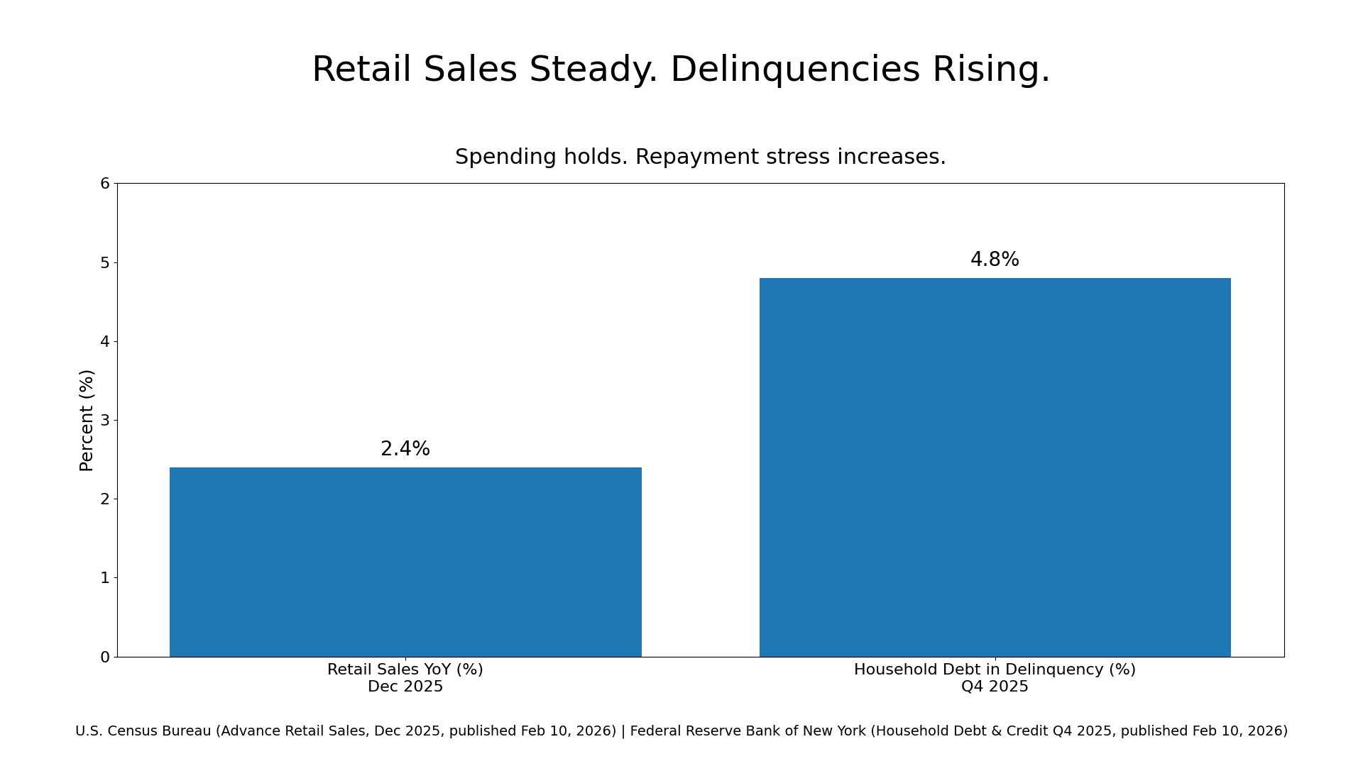 Retail sales remain stable, but rising delinquencies and elevated borrowing costs suggest repayment capacity is weakening at the margin.