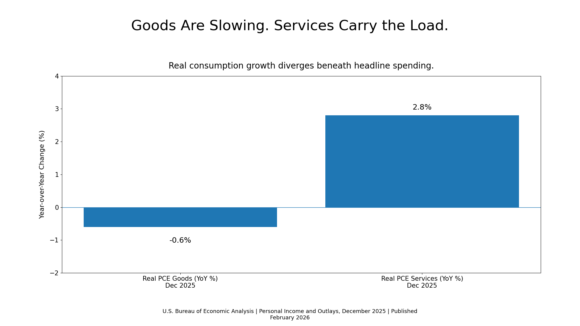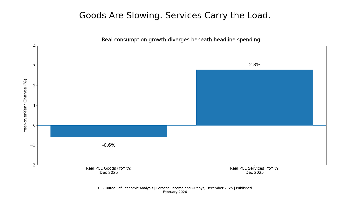 Broader consumption data reinforce the composition issue. The Bureau of Economic Analysis’ December 2025 Personal Income and Outlays release showed that growth in current-dollar personal consumption expenditures was driven by services, while goods spending declined.⁵ Real PCE increased only modestly.⁵ Retail sales, concentrated in goods and a narrow slice of services, therefore provide an incomplete read on household balance sheet pressure.