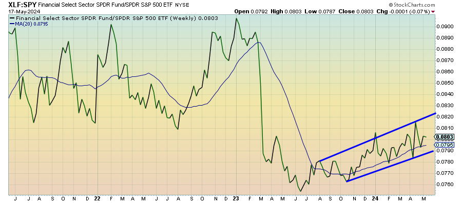 Financials have been one of the more durable equity market leaders for roughly 8 months now, although they’re still nowhere near where they were relative to the S&P 500 before the regional bank crisis. This looks a lot like a play on interest rates where investors are betting that the Fed is going to come through sooner than later on rate cuts. That outlook is questionable given inflation trends.