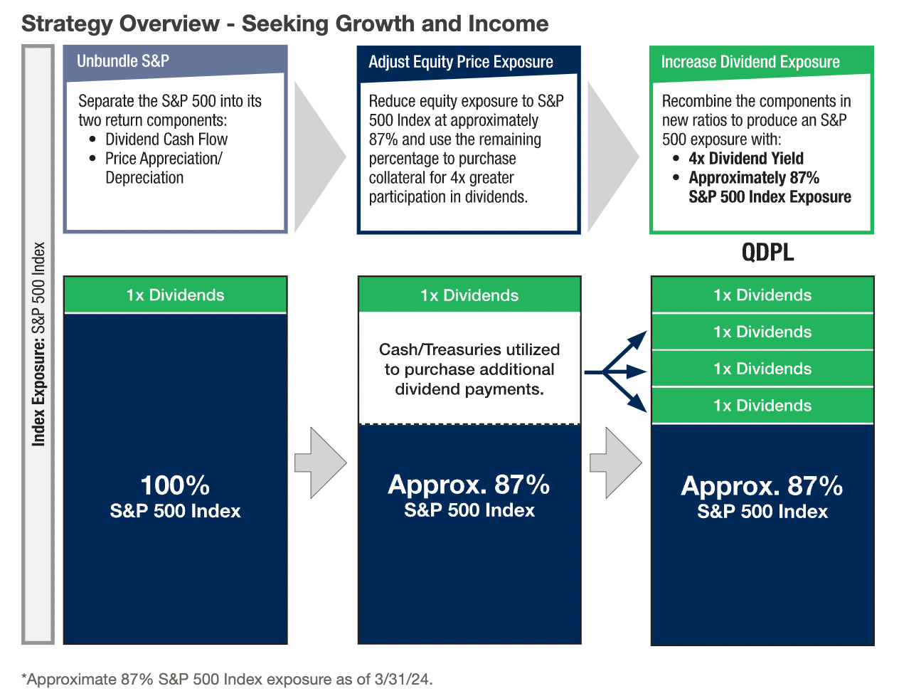 QDPL tracks an index based on the stocks in the S&P 500 index; long S&P dividend futures contracts and 3-year Treasuries. The objective is to provide 400% of the ordinary yield of the S&P 500 in exchange for reduced participation in the price performance, currently about 87% of the index’s performance.