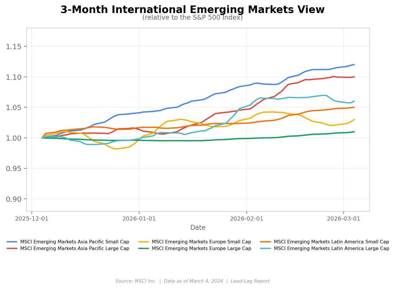 International developed markets have been outperforming the S&P 500 here and it’s not even close. European stocks posted more than 5% gains year-to-date before the recent sell-off tied to the Iran conflict, with the STOXX 600 hitting a new all-time high of 630 in mid-February. MSCI Asia Pacific is up similarly. In dollar terms, MSCI Europe has actually outpaced the S&P 500 by a wide margin over the past 12 months. This is a reversal of the U.S.-dominated leadership we saw for most of the prior decade. Germany’s massive fiscal package is a significant catalyst. A €500 billion off-budget infrastructure fund covering transport, digitalization, energy and hospitals, combined with a defense budget that has surged by roughly €25 billion this year to €119 billion total, is reshaping the investment landscape. After six consecutive years of economic stagnation, Germany is finally spending its way back toward growth. Goldman Sachs is projecting 1.1% GDP growth for the country this year, which isn’t spectacular, but represents a meaningful inflection point.