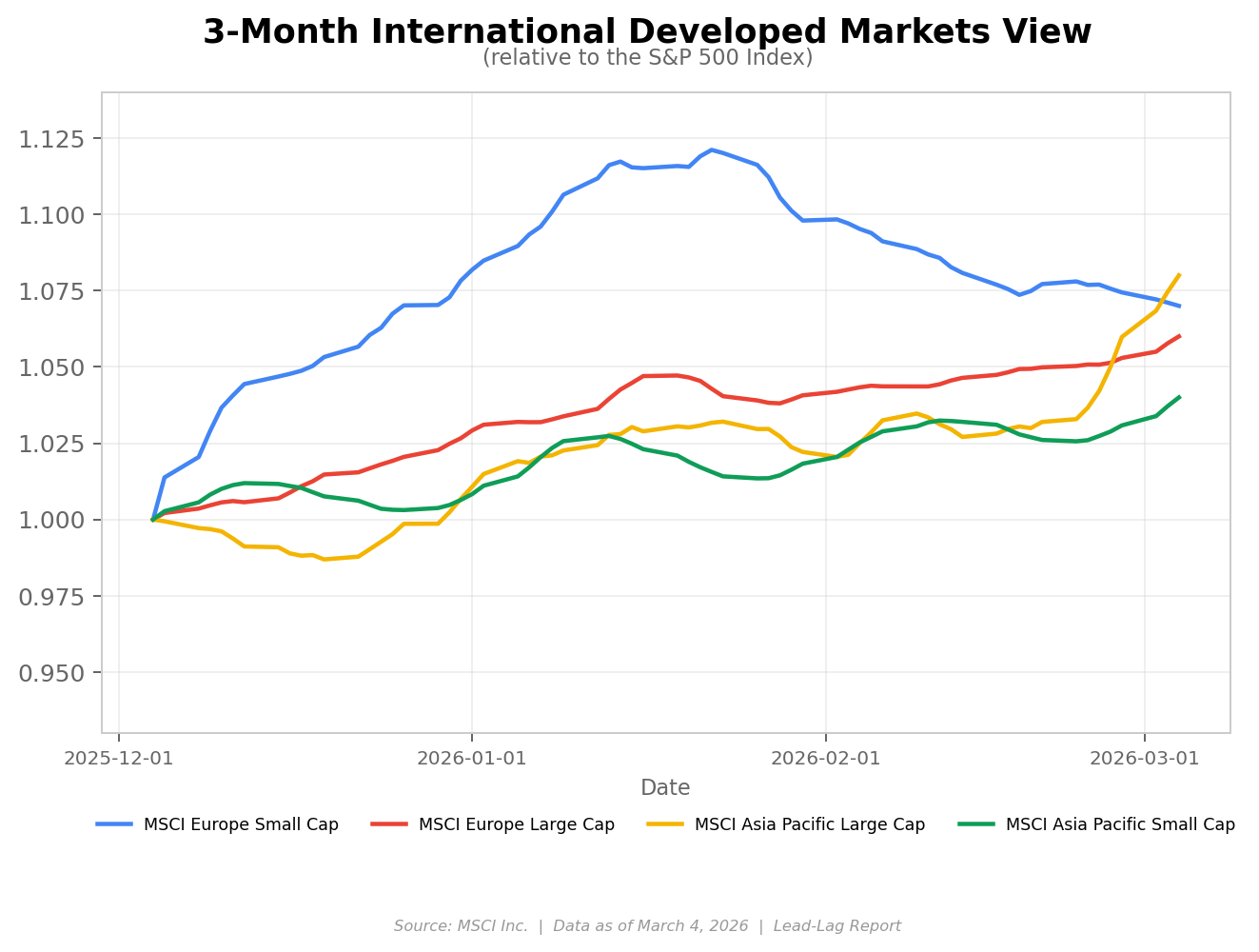 The ECB has held rates steady at 2.0% for five consecutive meetings now, and with Eurozone headline inflation ticking back up to 1.9% in February, there’s little pressure to cut further. In fact, the Iran conflict and the associated energy price shock have all but eliminated any residual chance of a near-term cut. Deutsche Bank’s base case now calls for the ECB to hold at 2% through 2026, with the next move potentially a hike in mid-2027. If the ECB remains on hold while the Fed is still cutting, it creates an interesting dynamic that should continue to support European equities relative to U.S. stocks in the near term.
