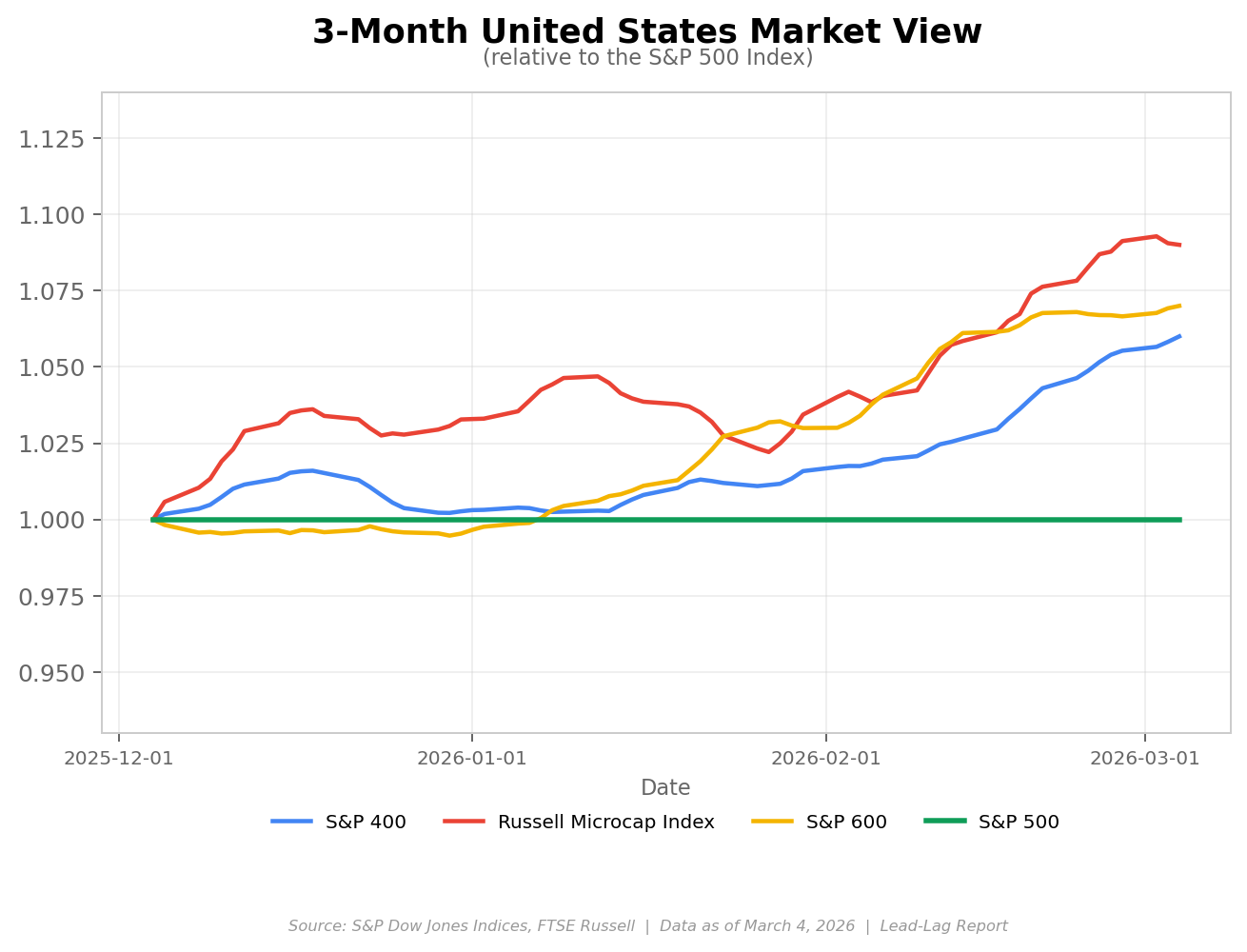 What’s driving this? The Fed’s rate cutting cycle, which has brought the funds rate down to 3.50-3.75%, is clearly benefiting smaller, more rate-sensitive companies. The January CPI reading came in at 2.4% year-over-year, suggesting that inflation is cooperating enough for the Fed to keep cutting. The market is pricing in roughly a 97% probability that the Fed holds steady at its March meeting. Before the Iran conflict escalated, futures were pointing to about a 48% probability of a rate cut by June, but the spike in oil prices and renewed inflation fears have since pushed the next expected cut out to September. If those cuts materialize later this year, it could add further fuel to the small-cap rally. The labor market, however, is something to watch. January payrolls came in at 130,000, which beat estimates, and the unemployment rate edged lower to 4.3% from 4.4% in December. It’s not alarming, but the trend is worth monitoring, especially for smaller companies that tend to feel labor market shifts more acutely.