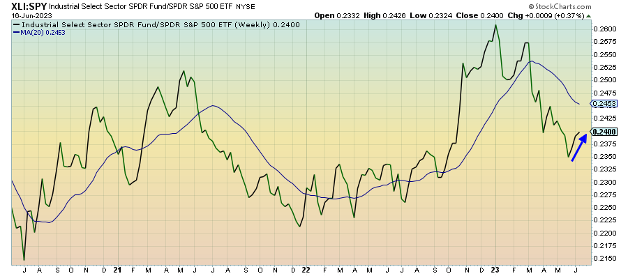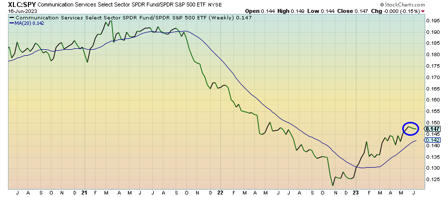 Communication services has leveled off a bit here, but I wouldn’t dismiss the broader trend here. All of the risk signals are risk-on at the moment and this ratio has a history of regularly establishing new highs over the past six months. If artificial intelligence emerges as a longer-term trade beyond just the short-term mania, this sector should be a prime beneficiary, but it’s likely to be a volatile ride.