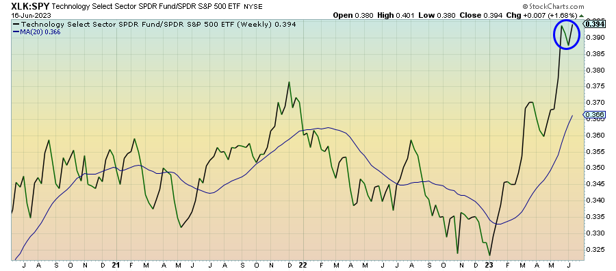 For now, it looks like the downturn from early June was merely an aberration. Tech stocks moved steadily higher throughout the entire week, but especially so after the Fed’s hawkish rate pause. There’s still a good deal of euphoria surrounding the AI and disruptive innovation trade and I’m not sure valuations are sustainable at this level. Sentiment may still push this ratio higher, but I sure would be hesitant about getting aggressive at these levels.